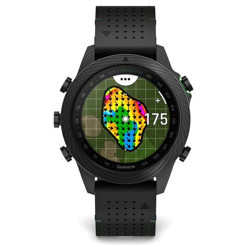 Elevate your game to the highest level. MARQ Golfer (Gen 2) - Carbon Edition is a modern tool watch like no other. The ultrastrong and lightweight case is machined from 130 layers of Fused Carbon Fiber material, which creates a unique pattern for every watch. A stunning AMOLED touchscreen display gives you up to 16 days of battery life in smartwatch mode and up to 42 hours in GPS mode. It has more than 43,000 preloaded golf courses and advanced game-tracking data, including an enhanced virtual caddie feature with a shot dispersion chart that provides recommendations for which club to use and where to aim. With the MARQ Golfer watch, your performance is set for excellence.