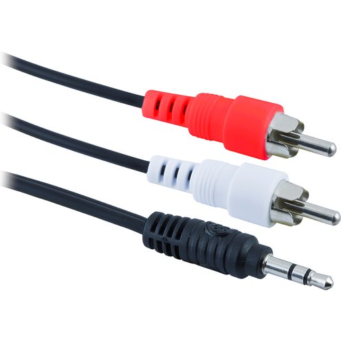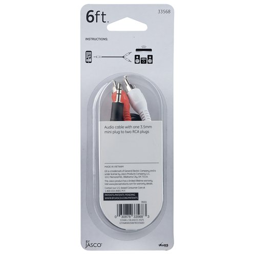 Experience superior audio from your home stereo system with the GE-branded Pro™ 6ft. Stereo Y Adapter Cable. This cable has one 3.5mm plug and two gold-plated RCA connectors to transfer audio signals from an Apple iPhone, iPod, tablet or other mobile audio device with a 3.5mm jack to your home stereo system equipped with stereo audio RCA jacks.