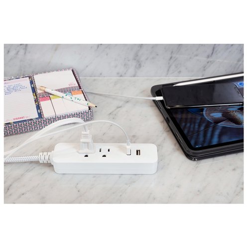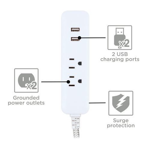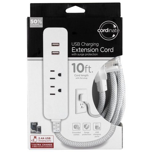 Extend your style into the future with the Cordinate 2-Outlet 2-USB Port Extension Cord. While most cords interrupt or distract from your home’s décor, this unique designer cable only contributes to the overall charm of your space. The 10ft. woven gray and white chevron fabric cord cover accents your home or work setup, increases the cable’s durability and keeps the cord from being bent and tangled. The thoughtful construction of the extension cord includes a space-saving flat plug, making it convenient to connect your devices where space is limited. This unit features dual USB-A ports for connecting two devices at once, with a total charging capability of 2.4A/12W. Conveniently charge your smartphone, tablet or mobile device from your centralized powering station. Additionally, the extension cord includes built-in surge protection to ensure that your connected equipment stays safe from harmful voltage spikes. For a premium design that offers equal parts fashion and function, choose the Cordinate 2-Outlet 2-USB Port Extension Cord.