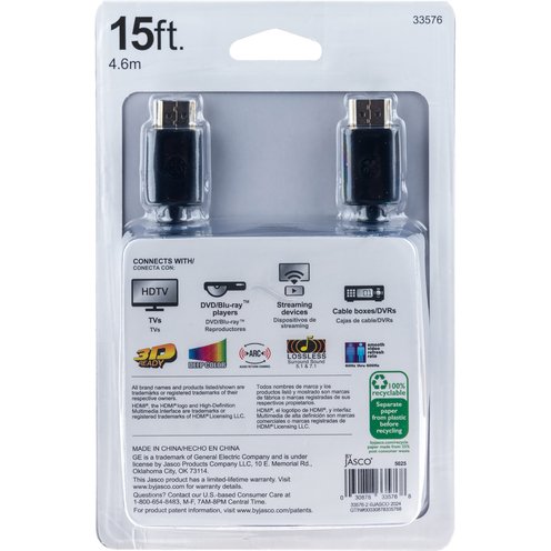 Connect with confidence and enhance your HDTV viewing experience with the GE-branded 15ft. HDMI Cable with Ethernet. Compatible with all HDMI-equipped devices, such as Blu-ray/DVD players, streaming devices, gaming consoles, laptops and more, this high-speed cable has gold-plated connectors to allow crystal-clear transfer of video and audio while you enjoy rich images with 4K Full HD — four times the resolution of traditional 1080p high-definition displays.