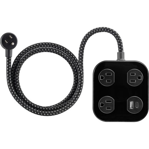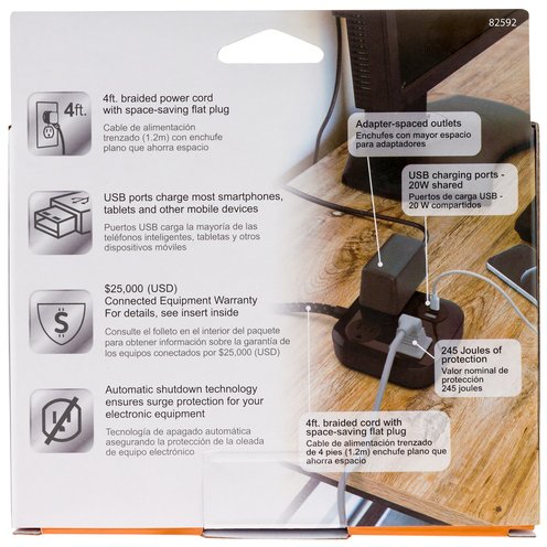 - Sleek design – The low-profile design, paired with the 4ft. braided cord and flat plug, takes up the least amount of space while providing room for the bulkiest of plugs and adapters; rubberized feet ensure the surge protector stays in place