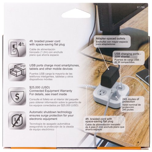 - Sleek design – The low-profile design, paired with the 4ft. braided cord and flat plug, takes up the least amount of space while providing room for the bulkiest of plugs and adapters; rubberized feet ensure the surge protector stays in place