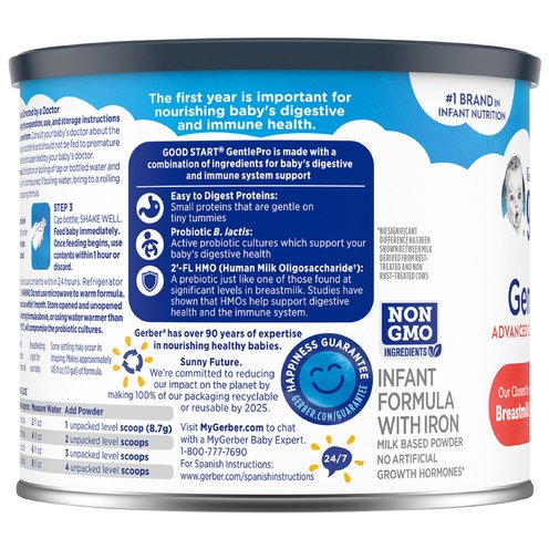 Good Start® GentlePro is the first and only infant formula made with a combination of prebiotics and probiotics to keep your growing baby’s tummy healthy. It also includes HMO*, which helps to support their digestive health and developing immune system. With probiotics, it provides everyday comfort for your little one and helps to promote soft poops! Good Start® GentlePro Formula has expert-recommended DHA to support healthy brain and eye development, and small, easy-to-digest Comfort Proteins® to help provide comfort for your little one's tummy.