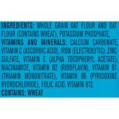 Ingredients: Whole Grain Oat Flour and Oat Flour (Contains Wheat), Potassium Phosphate, Vitamins and Minerals: Calcium Carbonate, Vitamin C (Ascorbic Acid), Iron (Electrolytic), Zinc Sulfate, Vitamin E (Alpha Tocopheryl Acetate), Niacinamide, Vitamin B2 (Riboflavin), Vitamin B1 (Thiamin Mononitrate), Vitamin B6 (Pyridoxine Hydrochloride), Vitamin B12, Folic Acid.