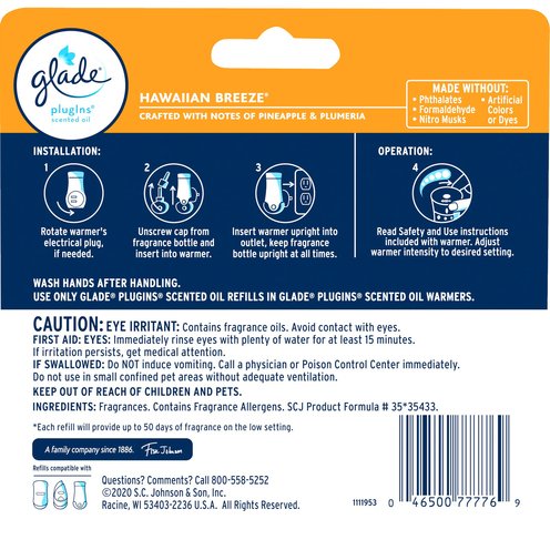 Crafted with notes of pineapple & plumeria. A family company. Authentic fragrances that lasts up to 250 days (Each refill will provide up to 50 days of fragrance on the low setting). Scratch breathe & feel. Fragrance infused with essential oils. Made without: Phthalates, formaldehyde, nitro musks, artificial colors or dyes. A family company since 1886. - Fisk Johnson. Refills compatible with.