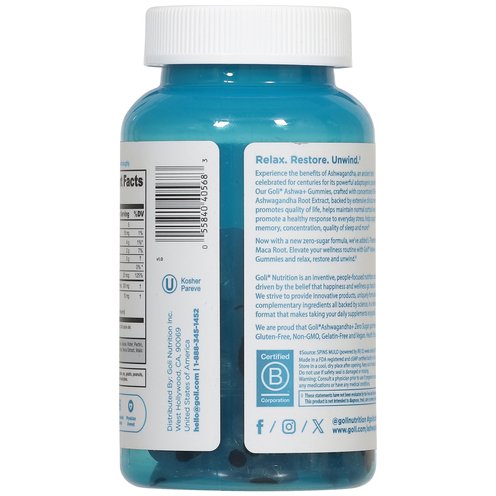 Our Goli Ashwa+ Gummies, crafted with concentrated KSM-66 Ashwagandha Root Extract, backed by extensive clinical research, promotes quality of life, helps maintain normal cortisol levels to promote a healthy response to everyday stress, helps support memory, concentration, quality of sleep and more! Now with a new zero-sugar formula, we've added L-Theanine and Maca Root. Elevate your wellness routine with Goli Ashwa+ Gummies and relax, restore and unwind. Goli Nutrition is an inventive, people-focused nuttrition company driven by the belief that happiness and wellness go hand in hand. We strive to provide innovative products, uniquely formulated with complementary ingredients all backed by science, un a delivery format that makes taking your daily supplements enjoyable.