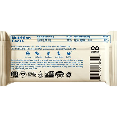 12 g protein. Organic. Vegan. Gluten-free. USDA Organic. Certified Organic by Quality Assurance International. Certified Organic by QAI. Certified vegan. Certified gluten free. Approved Food Product - FODMAP Friendly. Non-GMO Project verified. Heartwarming retreat. Live long. Eat positive. Give back. Tread lightly. Be well. Mother-daughter owned and based in a small rural community, our mission is to spread awareness for a clean, balanced lifestyle with products that make a positive impact on the planet. Our GoMacro facility is powered by 100% renewable energy, and our bars are made with high-quality, sustainably sourced, plant-based ingredients to help you have a healthy body, sharp mind, and bold spirit. Certified C.L.E.A.N.