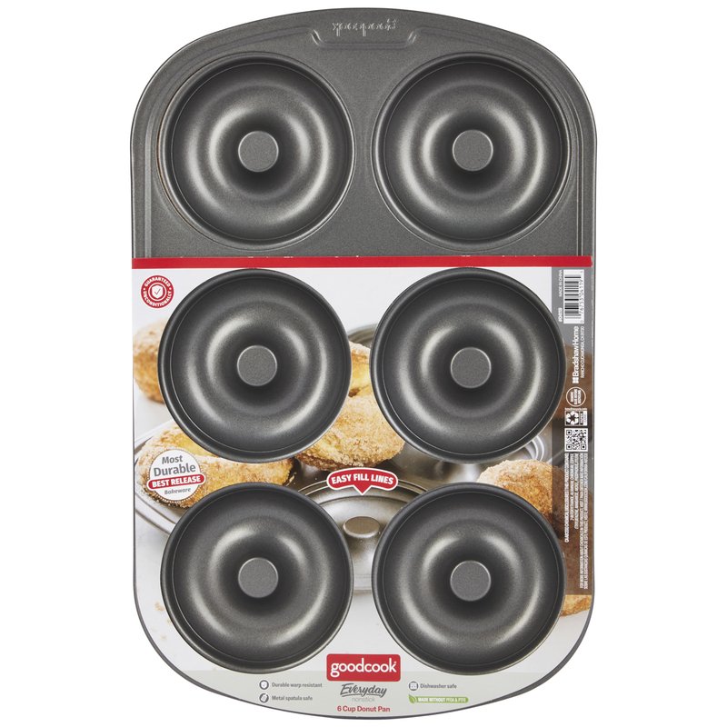 The GoodCook Donut Pan is designed especially for home cooks and features 6 cavities making it easy to bake a half dozen of delicious medium-size donuts or pastries in the oven, eliminating the hassle of deep frying. Heat is distributed evenly during the baking process to ensure a thorough bake for each donut in the cavities for the best tasting results. The scratch-resistant nonstick coating provides an excellent mess-free release and is metal spatula safe so you can serve your baked goods right out of the pans without worry. Constructed with heavy-duty gauge steel, the pan resists warping and provides long-lasting durability to offer years of high-quality baking. After use, the donut tray is dishwasher safe for a quick and easy clean up, but hand-washing is recommended for longer-lasting results.