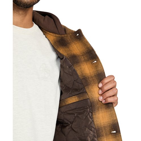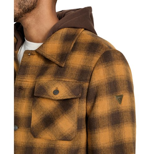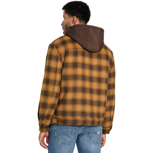 This wool blend check print jacket by GUESS features an attached hood, five pockets, and fully quilted lining for easy layering.