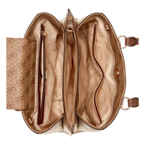 Triple top entry , 3 compartments and a double magnetic bridge closure. Center inside zip compartment . Outside zip pocket . Inside zip and open pockets .