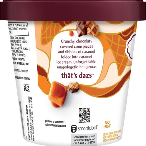 Crunchy, chocolaty covered cone pieces and ribbons of caramel folded into caramel ice cream. Unforgettable, unapologetic indulgence.