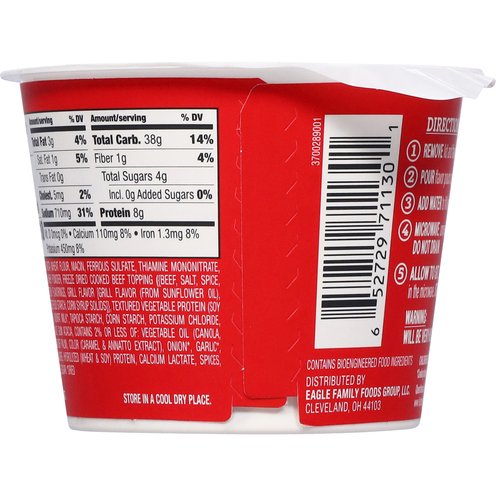 - Enriched Pasta (Wheat Flour, Niacin, Ferrous Sulfate, Thiamine Mononitrate, Riboflavin, Folic Acid), Whey Powder, Freeze Dried Cooked Beef Topping ({Beef, Salt, Spice, Hydrolyzed Corn Protein, Flavorings, Grill Flavor [Grill Flavor (from Sunflower Oil), Tapioca Dextrin, Modified Food Starch, Corn Syrup Solids]}, Textured Vegetable Protein (Soy Flour, Caramel Color)), Nonfat Milk*, Tapioca Starch, Corn Starch, Potassium Chloride, Mono & Diglycerides, Salt, Gum Acacia, Contains 2% or Less of: Vegetable Oil (Canola, Soybean, Sunflower and/or Palm), Color (Caramel & Annatto Extract), Onion*, Garlic*, Natural & Artificial Flavors, Hydrolyzed (Wheat & Soy) Protein, Calcium Lactate, Spices, Yeast Extract, Dextrose, Sugar, * Dried.