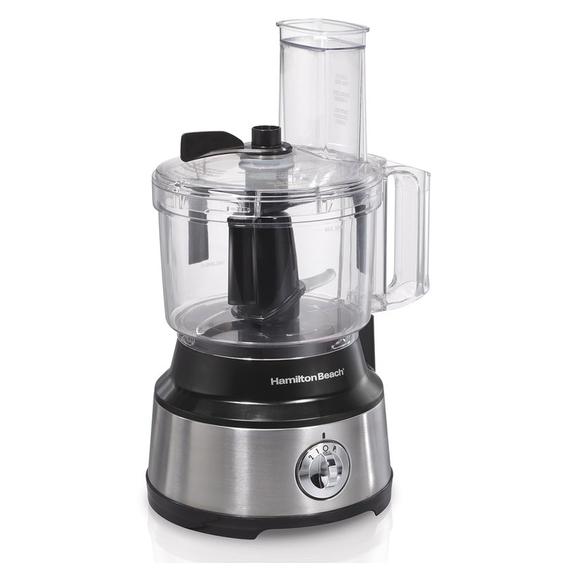 With the Hamilton Beach 10 Cup Food Processor with Bowl Scraper, there's no need to stop and remove the lid to dislodge food from the side of the bowl. The built-in scraper does the work for you, keeping food close to the blades for more even results. A stainless steel s-blade for chopping and purreeing, a reversible slicing/shredding disc, large feed chute, 450 watts and 2 speeds plus pulse offer power and control over ingredients.