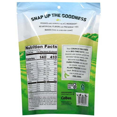 Baked green pea snacks. Flavored crisps. No artificial flavors or preservatives. Packed with 5 g of protein per serving. Gluten free. Certified gluten free. gfco.org. Creamy & mellow. Snap up the goodness. Veggies are always the #1 ingredient. Baked (this is a no-fry zone). That crunch you crave with big-time taste - our snacks are super satisfying without being sinful. And because our peas are farm-picked and milled in-house, they pack plant protein in every snap. Bring on the fiber, the flavor and the feel good.