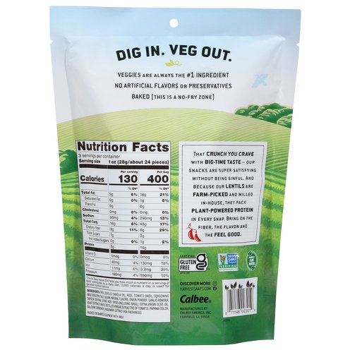 Flavored crisps. No artificial flavors or preservatives. Certified gluten free. Non-GMO Project verified. Tangy & zesty. Powered by plant protein. Dig in. Veg out. Veggies are always the no. 1 ingredient. Baked (This is a no-fry zone). That crunch you crave with big-time taste - our snacks are super satisfying without being sinful. And because our peas are farm-picked and milled in-house, they pack plant-powered protein in every snap. Bring on the fiber, the flavor and the feel good.