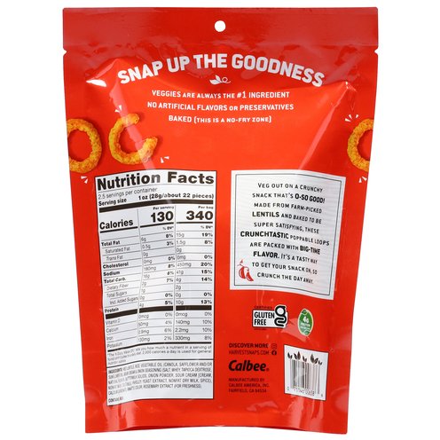 Baked red lentil snacks. Flavored crisps. No artificial flavors or preservatives. Packed with 4 g of protein per serving. Certified gluten free. Snap up the goodness. Veggies are always the #1 ingredient no artificial flavors or preservatives baked (this is a no-fry zone). Veg out on a crunchy snack that's o-so good! Made from farm-picked lentils and baked to be super satisfying, these crunchtastic poppable loops are packed with big-time flavor. It's a tasty way to get your snack on, so crunch the day away.