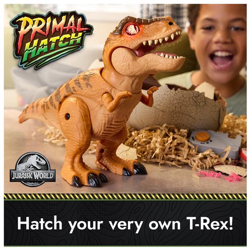 Hatch and Train your own baby dinosaur with the Primal Hatch T-Rex! Bring your dino to life as you watch it hatch for the very first time! This dino toy for boys and girls lets you watch your baby T-Rex hatch, and then decide whether it grows into a friend, or a fierce predator! With articulated features, more than 100 sounds and reactions and so interactive play modes, the Primal Hatch T-Rex is bound to keep your little Jurassic Park fan entertained for hours of fun! To start, hatch the T-Rex by tapping on the egg repeatedly, then watch in amazement as the egg begins to crack, and your baby dinosaur emerges through the gooey membrane of its egg! Use the clicker and food accessories to train the fierce dino into becoming a friend, or watch it grow into a dangerous predator! You decide what your baby dinosaur becomes! The Primal Hatch T-Rex is a fantastic addition to your kids collection of cool toys, dinosaur toys and Jurassic toys! Add it to your wish list for holiday toys, or birthday toys for boys and girls aged 5 & up!
