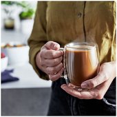 Tea times and coffee breaks just got more stylish with this sleek 2-piece mug set. The chic, translucent, double wall glass design maintains the toasty temperature of coffee and other hot beverages while remaining cool to the touch on the outside. You can also serve hot toddies or mulled wine on a cold winter day.