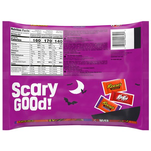 Reese's Peanut Butter Cups; Reese's Peanut Butter Pumpkins; Kit Kat Wafer Bar. 140-170 calories per serving. Reese's Peanut Butter Cups/Reese's Peanut Butter Pumpkins/Kit Kat Wafer Bar: Ingredient(s) derived from a bioengineered source. Assortment may vary. Scary good!