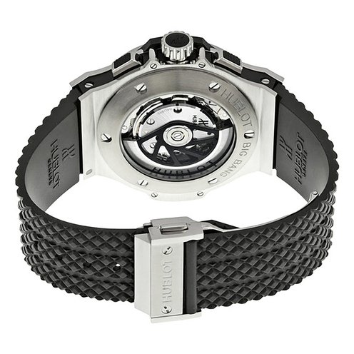 Men's Hublot Big Bang Steel. 44mm stainless steel case. Black structured rubber strap. Black chronograph dial with date display. Swiss Automatic chronograph movement.