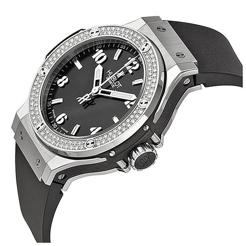 Ladies Hublot Big Bang Steel Diamonds. 38mm Stainless steel case. Two row diamond bezel. Lined rubber strap. Swiss Quartz movement.