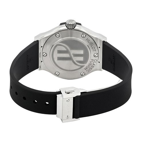 Ladies Hublot Classic Fusion. 33mm Titanium case. Diamond bezel. Black lined rubber strap. Black dial with date display. Swiss Quartz movement.