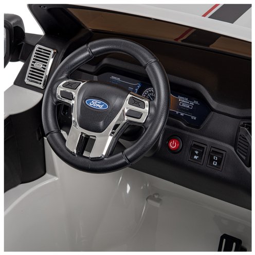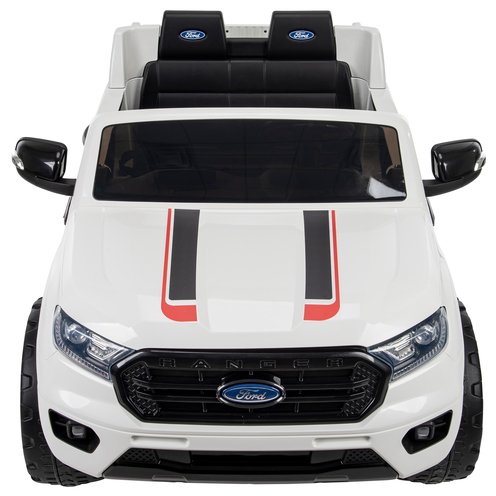 This white Ford Ranger Tremor for kids with red and black details will give your rider every feeling of being behind the wheel of a great Ford truck!Sharp and ready for the road ahead, this battery-powered ride-in for children looks like the real deal. Complete with Ford branded seats, working doors, and engine sounds, this kids’ truck has everything it needs.The LED headlights turn on and off and the roaring engine sounds make this an action-packed ride.