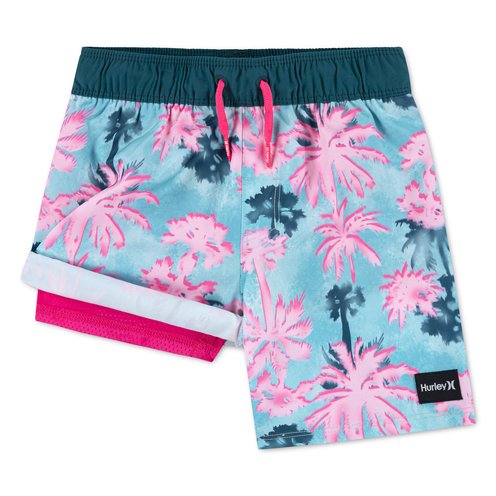 Bright colors and tropical palm prints bring fun beach energy to these swim shorts. The lightweight 4-way stretch twill fabric moves easily with every jump, swim, and splash, while the pull-on waistband with drawcord keeps the fit secure during all his water adventures. Built-in mesh compression shorts add extra comfort and support for active days at the pool or beach.
