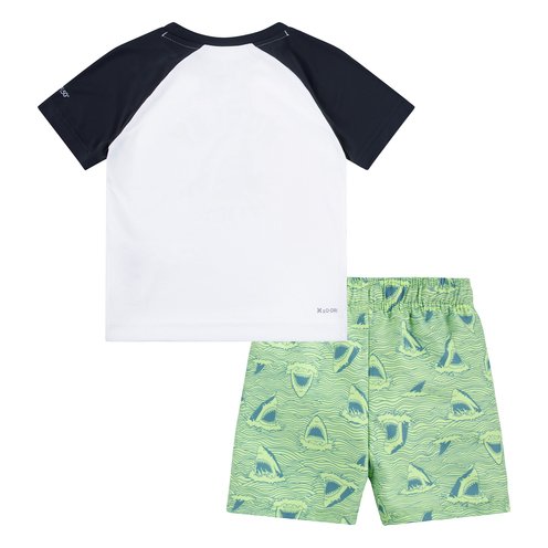 Shark-doodle graphics make this rashguard set a standout favorite. UPF coverage keeps him protected while soft fabric keeps him comfy. Perfect for little swimmers with big imaginations.