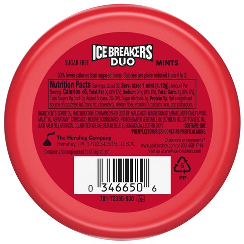 Sugar free mints with cooling crystals. Artificial flavor. Sugar free. 30% fewer calories than sugared mints. Calories per piece reduced from 4 to 3. Contains a bioengineered food ingredient. One. Many. Fruit + cool.
