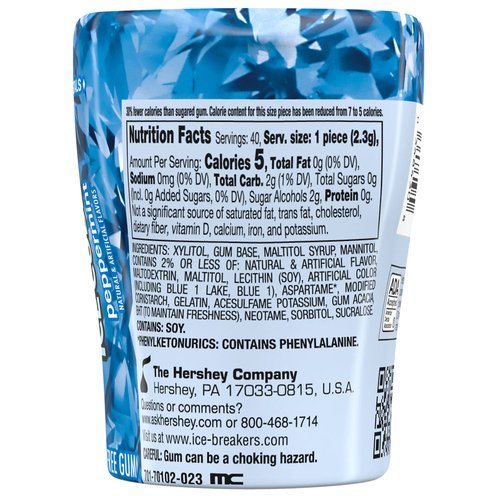 - Xylitol, Gum Base, Maltitol Syrup, Mannitol, Contains 2% or Less of: Natural & Artificial Flavor, Maltodextrin, Maltitol, Lecithin (Soy), Artificial Color (Including Blue 1 Lake, Blue 1), Aspartame (Phenylketonurics: Contains Phenylalanine), Modified Cornstarch, Gelatin, Acesulfame Potassium, Gum Acacia, BHT (to Maintain Freshness), Neotame, Sorbitol, Sucralose.