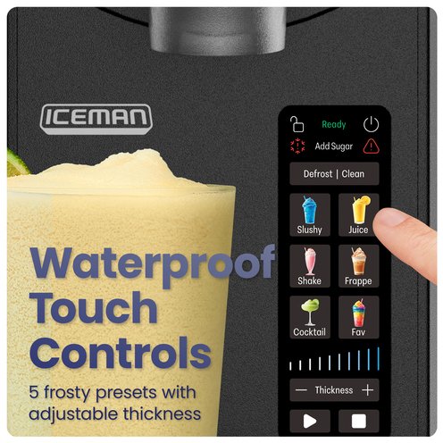 - WATERPROOF TOUCH CONTROLS: Set up your slushies with the intuitive control panel, featuring a Defrost / Clean button to cycle water through the tank and an Add Sugar alert so everything freezes properly.