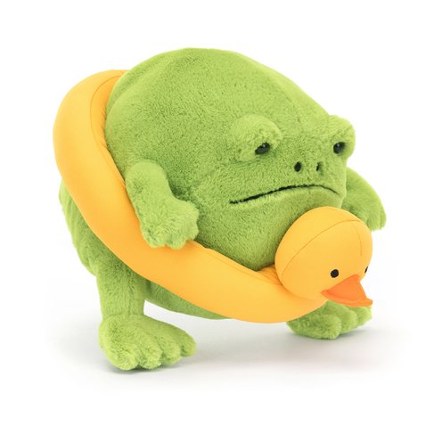 Ricky Rain Frog is ready to relax. Our favorite grumpy frog has found a duck rubber ring in bright yellow cotton to compliment his soft, pea-green fur. Ricky may be sporting a big, stitched frown, but this frog’s got summer vibes for everyone!