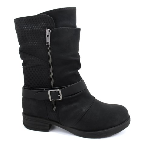 Mid-shaft low heel boot with side zip. Slouch styling with perf detail. Low burnished heel. All day comfort, but fashionable for those fall days.