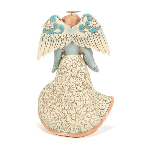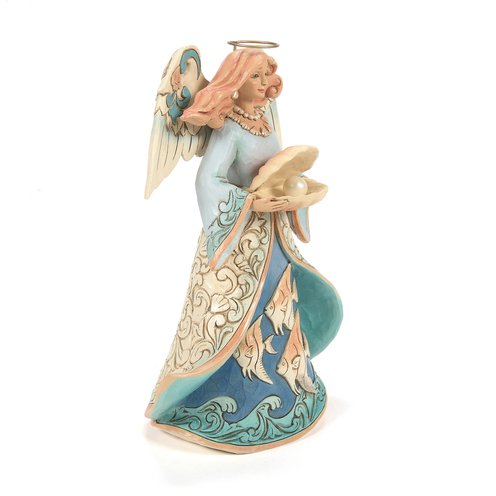 Embrace the enchanting beauty of the sea with this stunning Jim Shore angel figurine adorned in intricate blue tones, featuring delicate rosemaling and treasures from the depths. Fish dance across her gown as she shares a shell with a shining pearl.