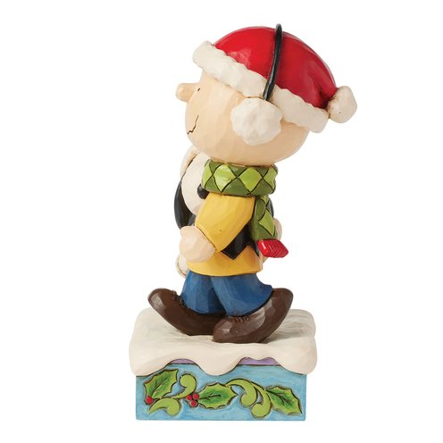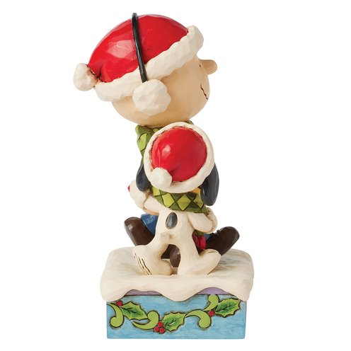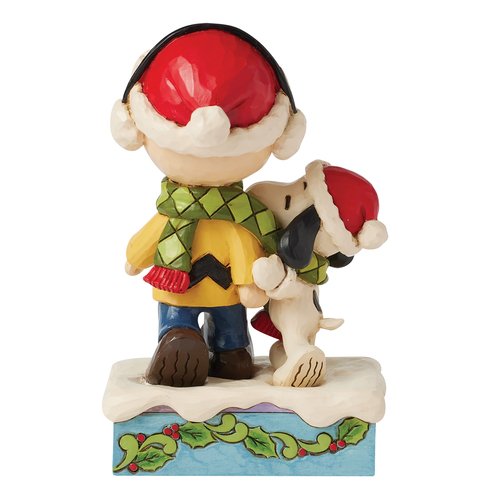 Celebrate the spirit of friendship with this heartwarming Jim Shore design of Snoopy and Charlie Brown holding hands, wearing matching Santa hats and sharing a cozy scarf. Their close bond and festive attire capture the essence of holiday cheer.