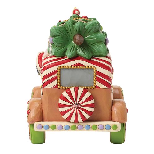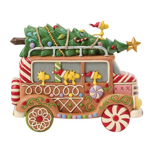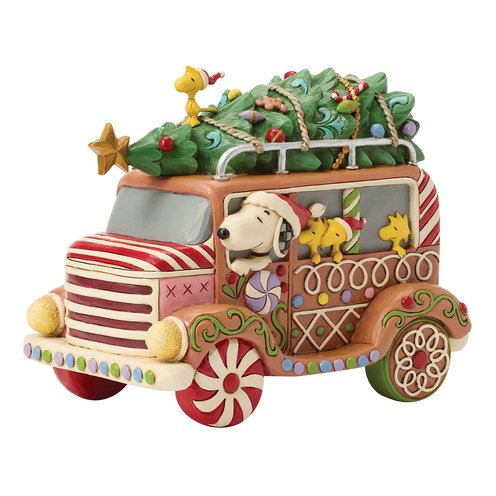 Brighten your holiday season with this playful Jim Shore design of Snoopy driving a festive gingerbread cookie van. Snoopy steers with joy as peppermint wheels spin, while Woodstock rides on the roof with a decorated Christmas tree in tow.