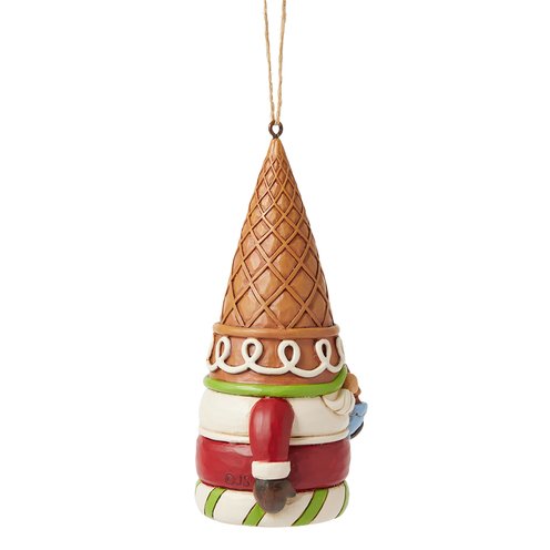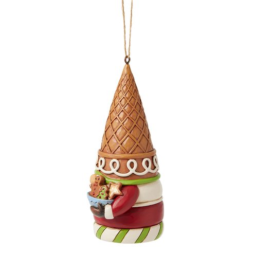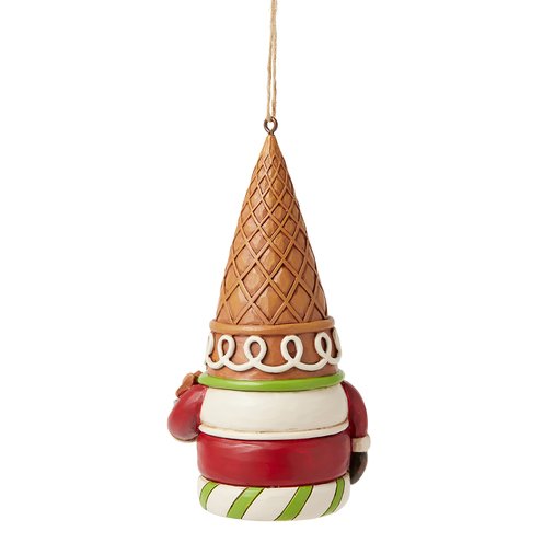 This whimsical Jim Shore Gingerbread Christmas ornament presents a charming gingerbread gnome, adorned with red and green icing and sprinkles, wearing an ice cream cone as a hat. Holding a bowl of candy, he'll bring a sweet and festive spirit to your holiday.