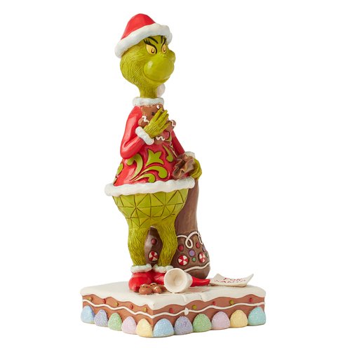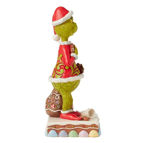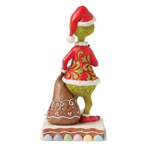 Dressed as Santa with a sack to steal presents, The Grinch gleefully munches on cookies and spills Santa's milk. Adorned with Jim Shore's signature rosemaling and intricate details, this piece brings The Grinch's playfully sinister spirit to life.