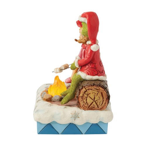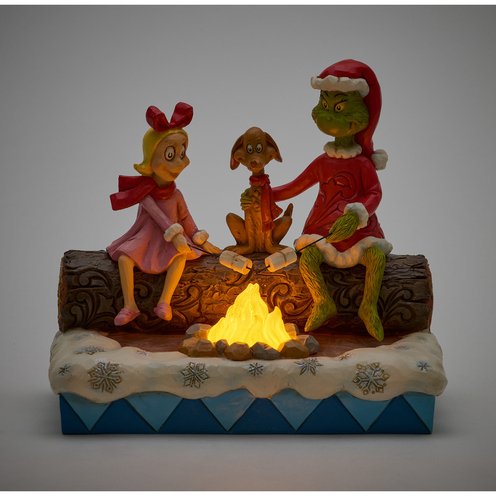 Roasting marshmallows on the open fire, Grinch, Max and Cindy Lou prepares the fixings for a s'more. With flicker flames, this sweet scene is inspired by camp days in the fresh forest air.
