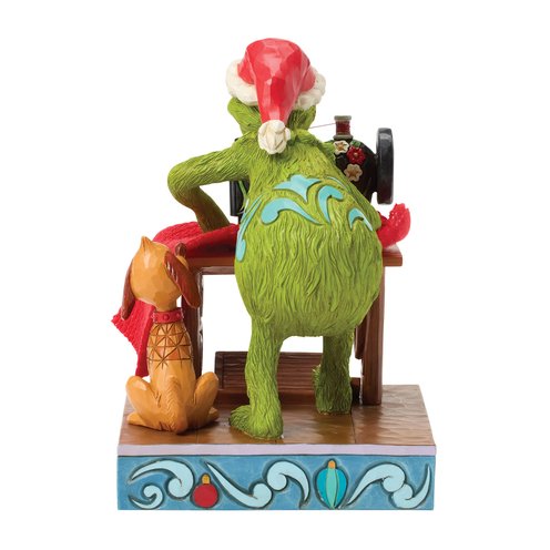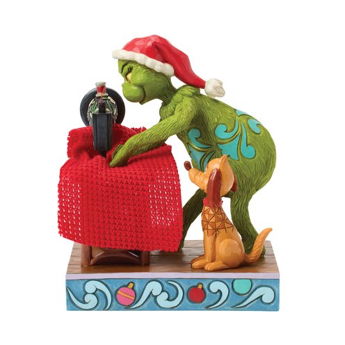 Inspired by his scheme to steal Christmas, The Grinch sews his Santa suit as Max watches curiously by his side. Complete with Jim Shore's floral patterns on the sewing machine and signature detailing, this piece captures crafty holiday mischief.