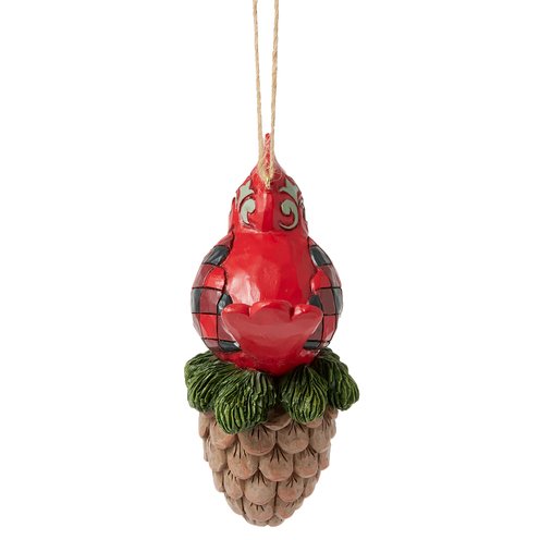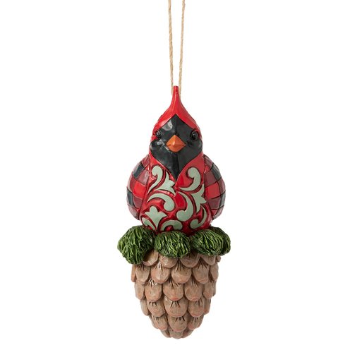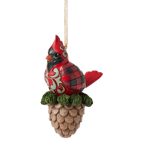 This delightful Jim Shore Highland Glen ornament features a vibrant cardinal adorned with buffalo plaid wings and intricate green rosemaling. Perched gracefully atop a pine cone, this sweet piece captures the essence of winter beauty and holiday spirit.