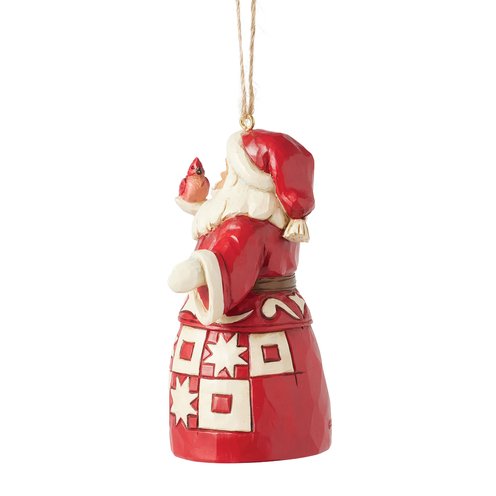 This charming Nordic Noel Jim Shore ornament features Santa holding a vibrant cardinal, embodying the joy of the season. His coat showcases the artist's iconic patchwork patterning and delicate rosemaling, adding a delightful touch of artistry.