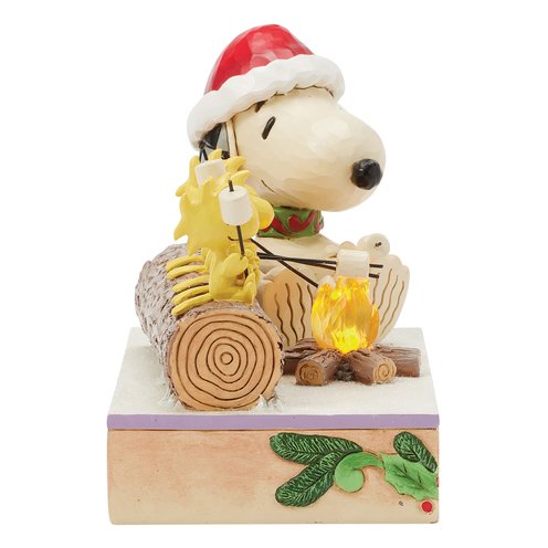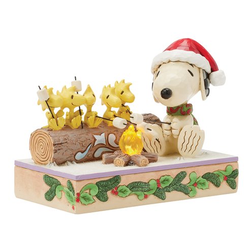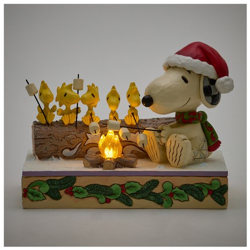 Warm up your holiday decor with this charming Jim Shore design of Snoopy and Woodstocks roasting marshmallows over a cozy LED flickering fire. Snoopy wears a Santa has as he shares a joyful smile and sweet treats with his feathered friends.