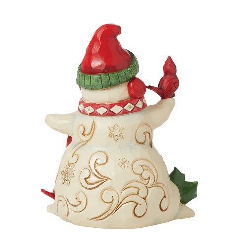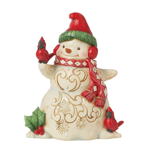 With a red and green hat and scarf, this smiling little snowman from Jim Shore wears a pair of earmuffs and a smile. Patterned with rosemaling and snowflakes, mistletoe sprouts at the snowman's feet while two cardinals enjoy his company.