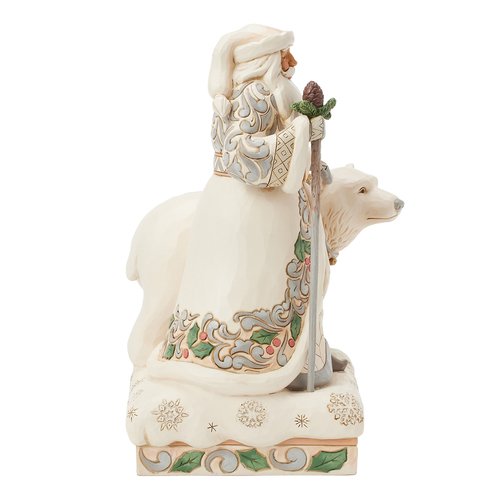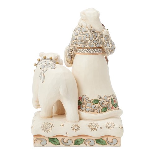 This exquisite Jim Shore design places Santa in a lavish rosemaling cloak adorned with holly and gold, as he radiates elegance and festive charm. Walking alongside a polar bear wearing a jingle bell collar, they capture the spirit of winter wonder.