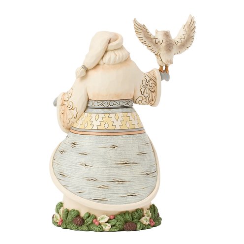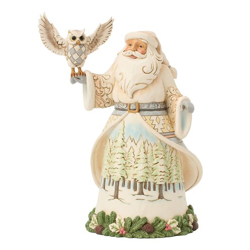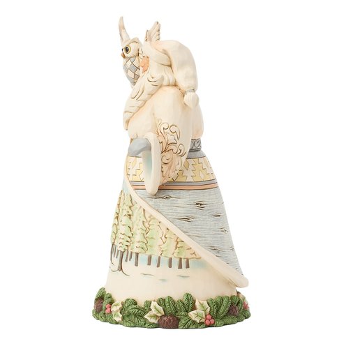 This stunning Jim Shore design features Santa adorned in a gorgeous white cloak trimmed with lush garland, reaching out to a majestic owl. The details of his cloak unveil a serene forest scene, embodying the tranquility of winter in the woodland.