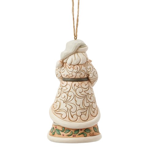 This heartwarming Jim Shore ornament features Santa cradling an adorable fawn in his arms, embodying the spirit of compassion and joy. His beautifully detailed cloak shares a captivating scene of the North Pole, complete with prancing reindeer.