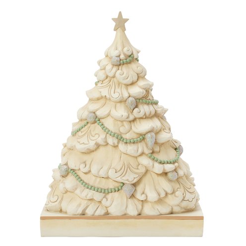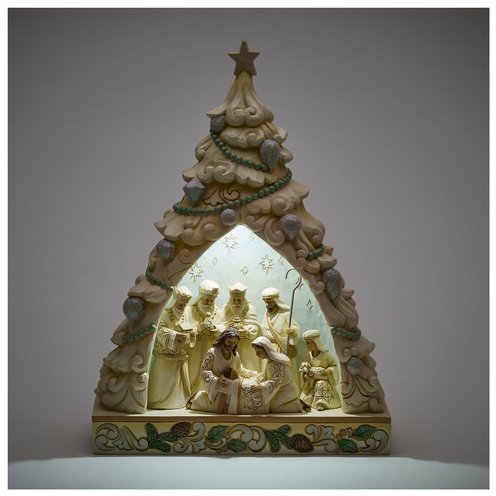 Complete with LED lights, this exquisite Jim Shore white and gold Christmas tree is cutout to reveal a breathtaking manger scene. Surrounded by stars, the holy family, shepherds, and wise men watch sleeping baby Jesus with awe and reverence.