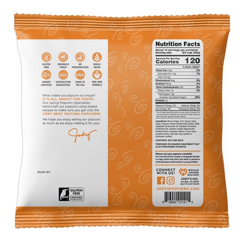 Share this extra-large bag of Jody's decadent Caramel Corn! Each popcorn kernel is richly coated with a delicious caramel coating made in small batches. The popcorn is a Virginia Finest product, Certified Gluten Free and Kosher. After the first bite, you won't be able to stop eating this deliciousl popcorn!
